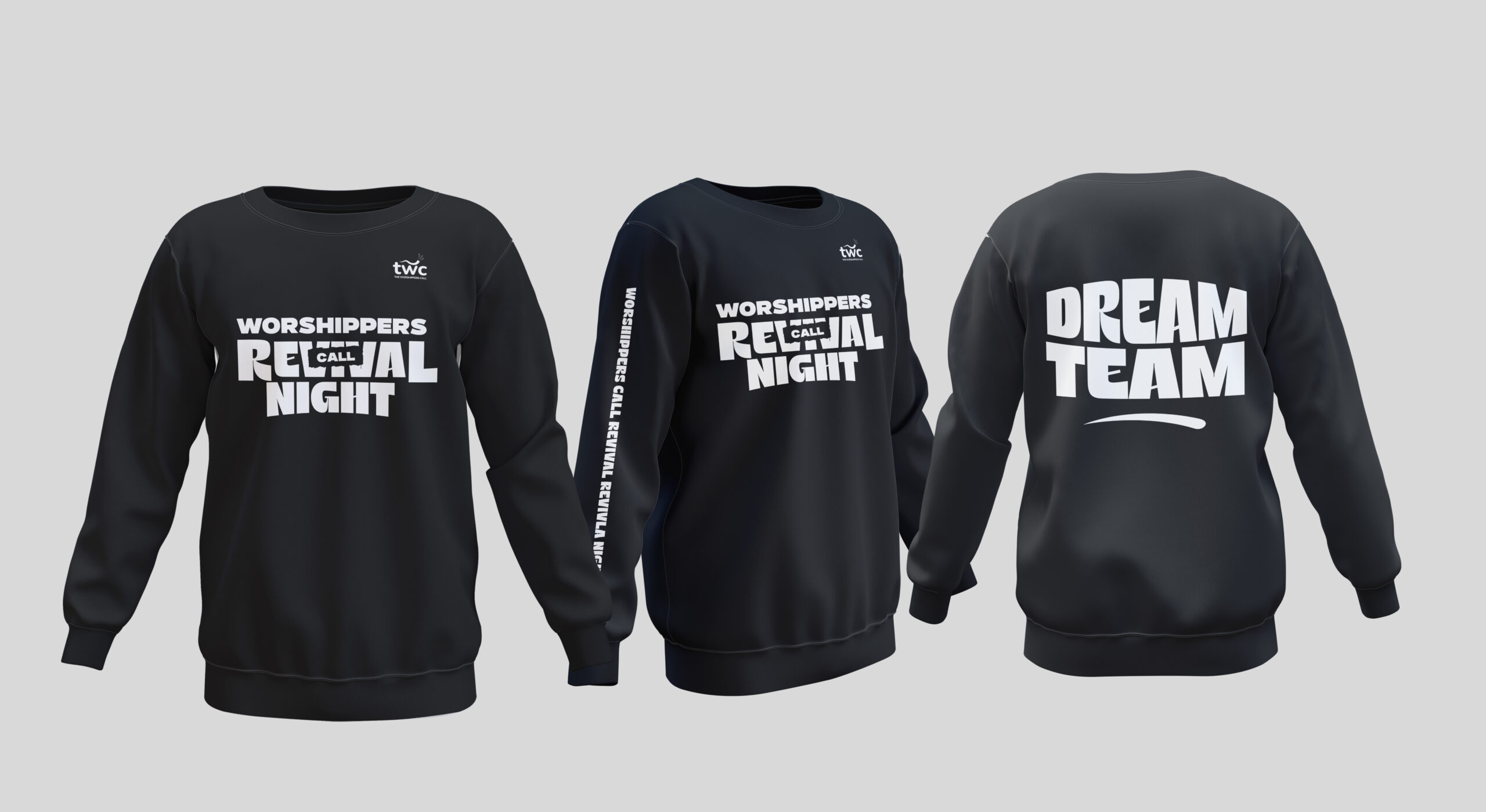 The Ultimate Service Uniform. Stay warm and focused during every move of God with the Worshippers Call Revival Night Dream Team Sweatshirt. Featuring bold event branding on the front and the iconic DREAM TEAM graphic on the back, this premium black long-sleeve is designed for those dedicated to serving with excellence. It’s more than a layer—it’s a symbol of your commitment to the house.